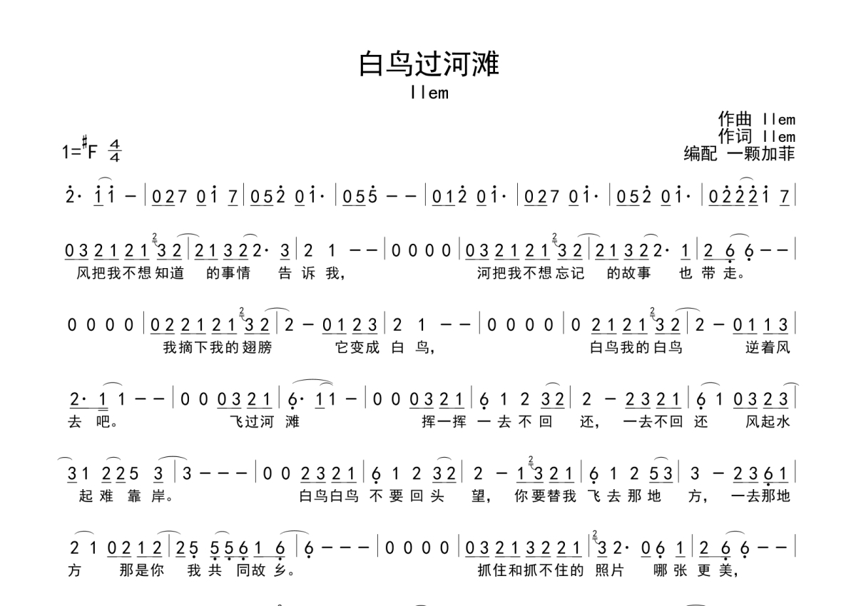 《白鸟过河滩》是liem演唱的一首歌曲,这份简谱共有一张高清图谱,图谱由 @一颗加菲 编配上传。