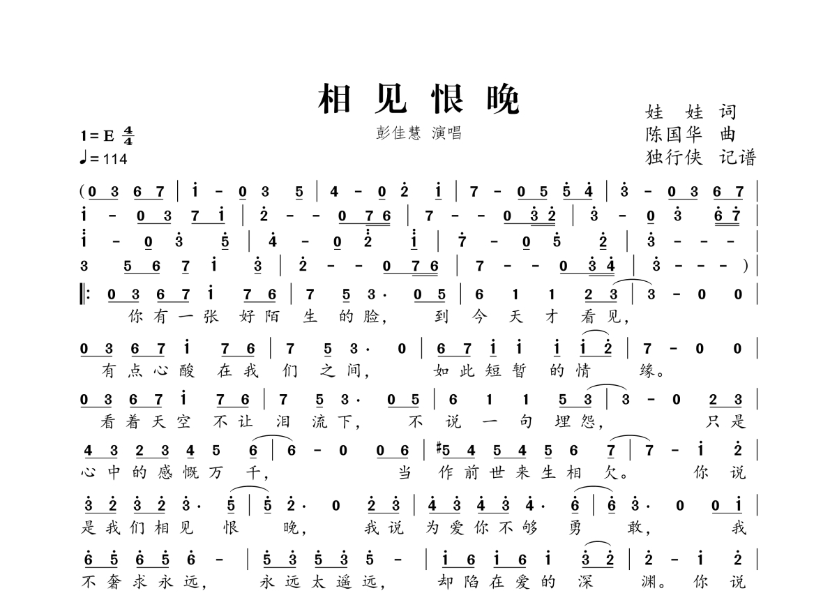 《相见恨晚》是彭佳慧演唱的一首歌曲,拍号为4/4拍,歌曲速度为每分钟114拍,这份简谱共有一张高清图谱,图谱由 @独行侠 编配上传。
