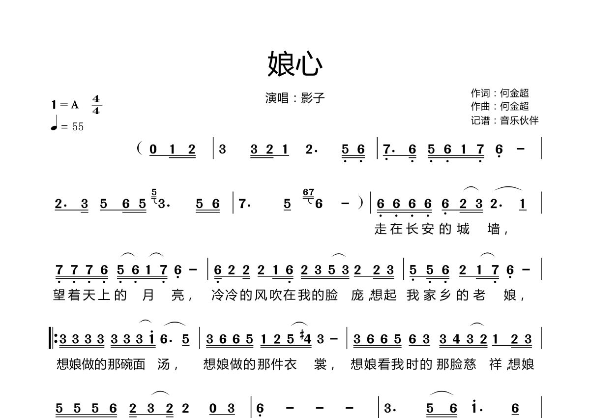 《娘心》是影子演唱的一首歌曲,拍号为4/4拍,歌曲速度为每分钟55拍,这份简谱共有两张高清图谱,图谱由 @音乐伙伴 编配上传。