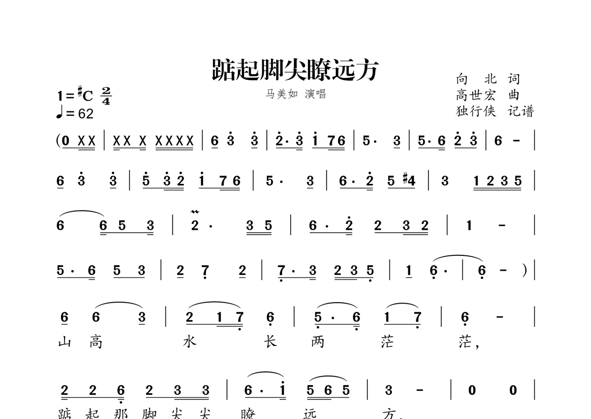 《踮起脚尖瞭远方》是马美如演唱的一首歌曲,拍号为2/4拍,歌曲速度为每分钟62拍,这份简谱共有两张高清图谱,图谱由 @独行侠 编配上传。