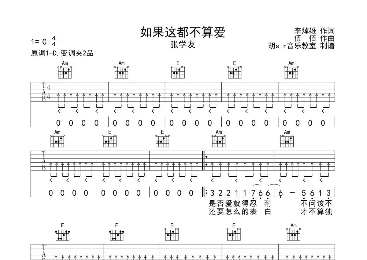 《如果这都不算爱》是张学友演唱的一首歌曲,本吉他谱采用的是C调指法编配,这份吉他谱共有两张高清图谱,图谱由 @胡sir音乐 编配上传,图谱使用六线谱编配,包含吉他和弦指法、简谱以及歌词部分,使用这份如果这都不算爱吉他谱,可以让你更加方便地掌握这首歌曲的弹唱技巧,快来尝试吧。 如果这都不算爱吉他谱,变调夹2品,原调D调,选用C调,张学友经典歌曲,如果这都不算爱,有什么悲哀,是我活该。或许是因为伍佰作的曲,学友唱出来有一种不羁的感觉,一个哀伤的故事在DJ的慢摇中仿佛故事中的人毫不在意一般。