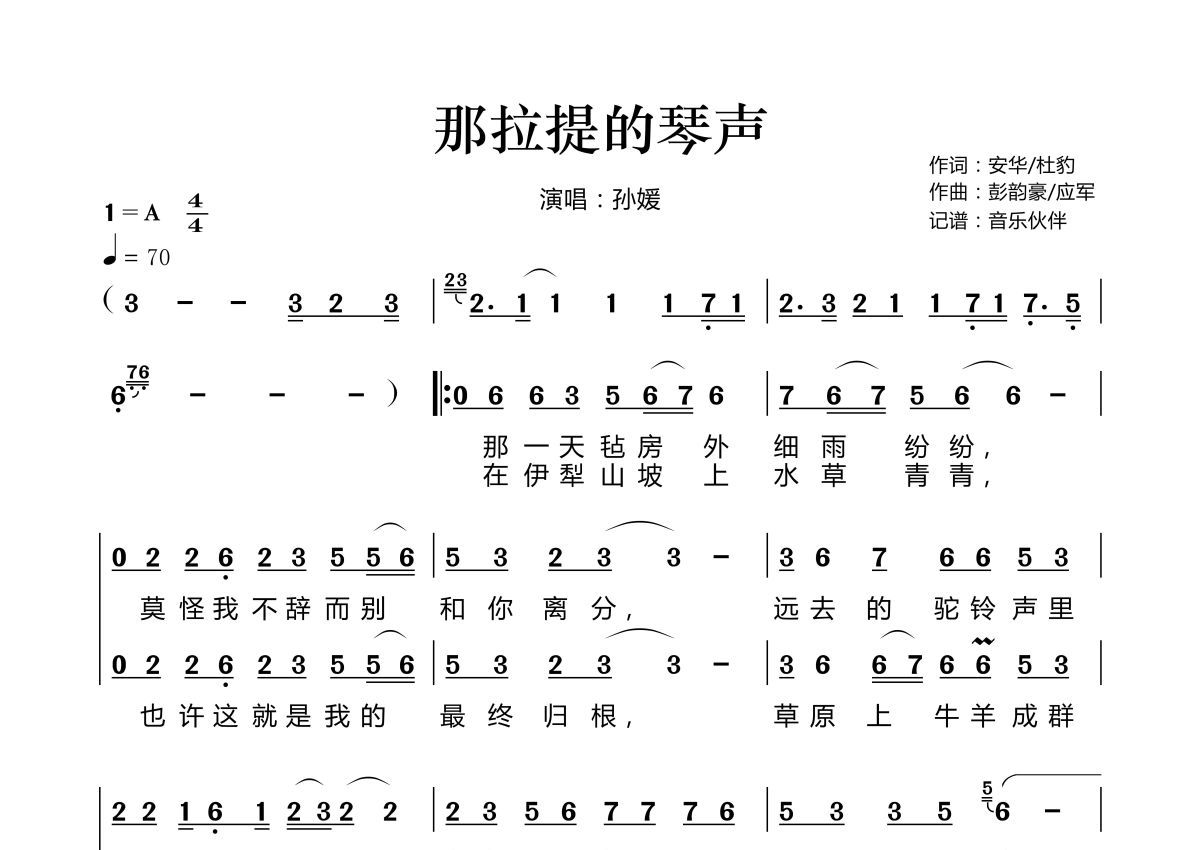 《那拉提的琴声》是孙媛演唱的一首歌曲,这份简谱共有两张高清图谱,图谱由 @音乐伙伴 编配上传。