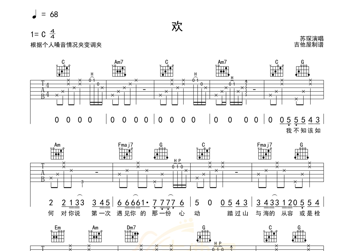 《欢》是苏琛演唱的一首歌曲,本吉他谱采用的是C调指法编配,这份吉他谱共有两张高清图谱,图谱由 @吉他屋 编配上传,图谱使用六线谱编配,包含吉他和弦指法、简谱以及歌词部分,使用这份欢吉他谱,可以让你更加方便地掌握这首歌曲的弹唱技巧,快来尝试吧。苏琛《欢》吉他谱_C调吉他弹唱谱。