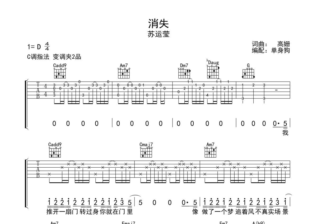 《消失》是苏运莹演唱的一首歌曲,拍号为4/4拍,歌曲原调为D调,但由于原调指法比较难,为了方便弹奏,本吉他谱采用的是C调指法编配,变调夹2品弹奏即为原调,当然也可以根据自己的音域改变变调夹位置,或者通过改变和弦调性,以方便自己弹奏,这份吉他谱共有三张高清图谱,图谱由 @单身狗 编配上传,图谱使用六线谱编配,包含吉他和弦指法、简谱以及歌词部分,使用这份消失吉他谱,可以让你更加方便地掌握这首歌曲的弹唱技巧,快来尝试吧。