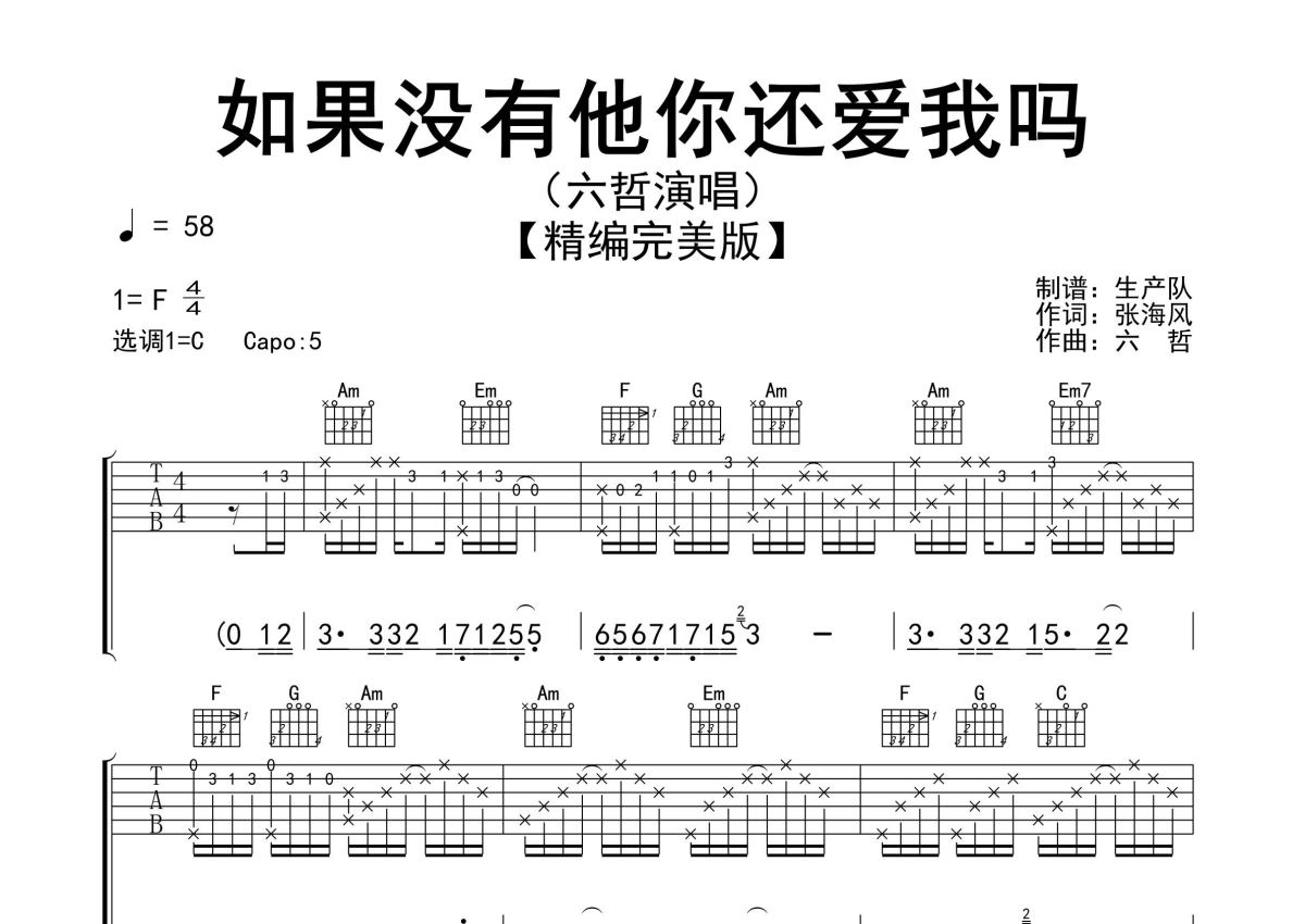 《如果没有他你还爱我吗》是六哲演唱的一首歌曲,精编完美版,拍号为4/4拍,歌曲速度为每分钟58拍,歌曲原调为F调,但由于原调指法比较难,为了方便弹奏,本吉他谱采用的是C调指法编配,变调夹5品弹奏即为原调,当然也可以根据自己的音域改变变调夹位置,或者通过改变和弦调性,以方便自己弹奏,这份吉他谱共有三张高清图谱,图谱由 @生产队 编配上传,图谱使用六线谱编配,包含吉他和弦指法、简谱以及歌词部分,使用这份如果没有他你还爱我吗吉他谱,可以让你更加方便地掌握这首歌曲的弹唱技巧,快来尝试吧。六哲演唱的歌曲《如果没有他你还爱我吗》原版吉他谱,完整的前奏、间奏、尾奏solo编配,精编完美版,怀旧经典!。