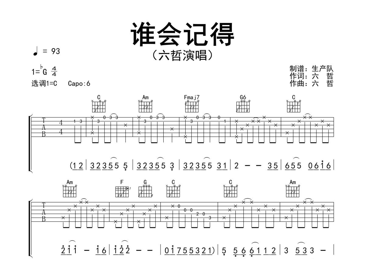 《谁会记得》是六哲演唱的一首歌曲,精编完美版,拍号为4/4拍,歌曲速度为每分钟93拍,歌曲原调为Gb调,但由于原调指法比较难,为了方便弹奏,本吉他谱采用的是C调指法编配,变调夹6品弹奏即为原调,当然也可以根据自己的音域改变变调夹位置,或者通过改变和弦调性,以方便自己弹奏,这份吉他谱共有三张高清图谱,图谱由 @生产队 编配上传,图谱使用六线谱编配,包含吉他和弦指法、简谱以及歌词部分,使用这份谁会记得吉他谱,可以让你更加方便地掌握这首歌曲的弹唱技巧,快来尝试吧。六哲作词、作曲并演唱的歌曲《谁会记得》原版吉他谱,完整的前奏、间奏、尾奏solo编配,精编完美版,怀旧经典!。