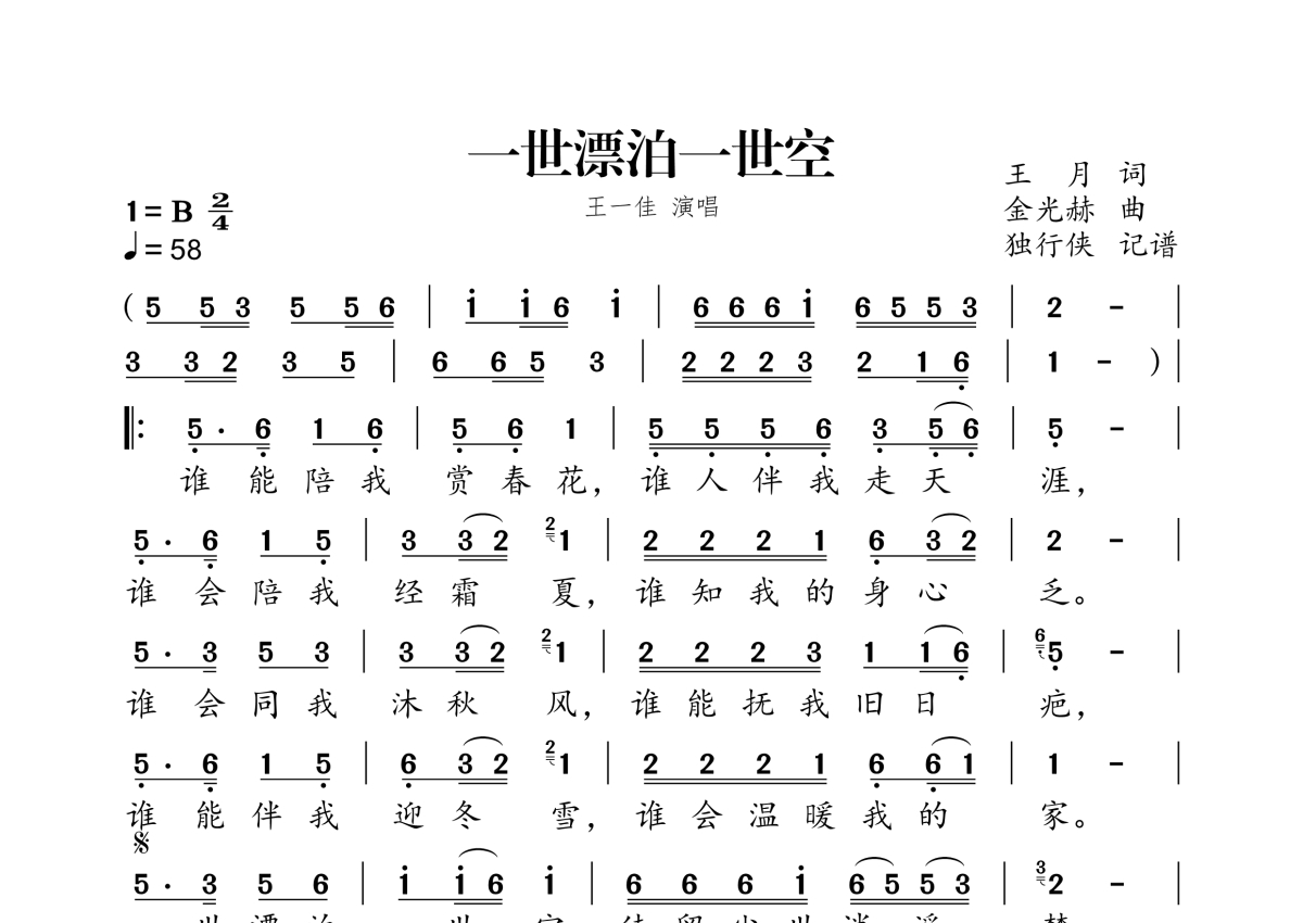 《一世漂泊一世空》是王一佳演唱的一首歌曲,拍号为2/4拍,歌曲速度为每分钟58拍,这份简谱共有一张高清图谱,图谱由 @独行侠 编配上传。