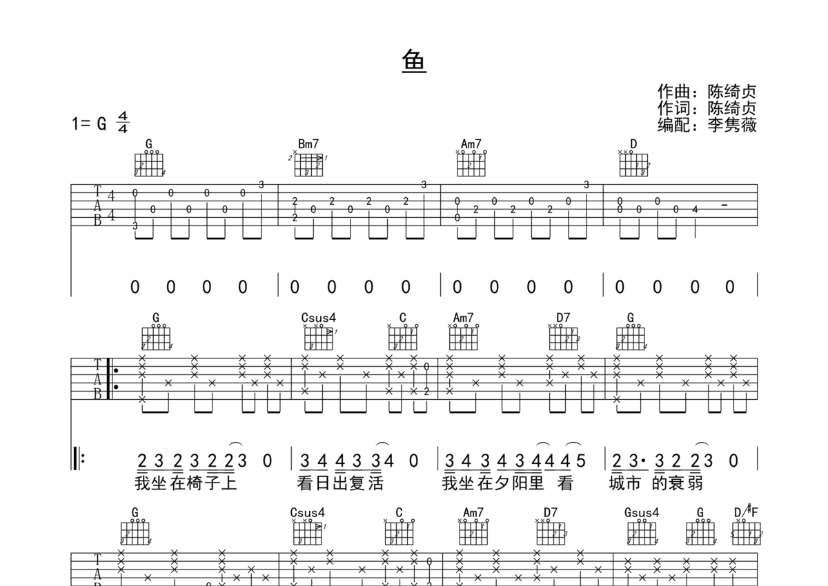 鱼吉他谱 - 陈绮贞演唱 - G调弹唱六线谱