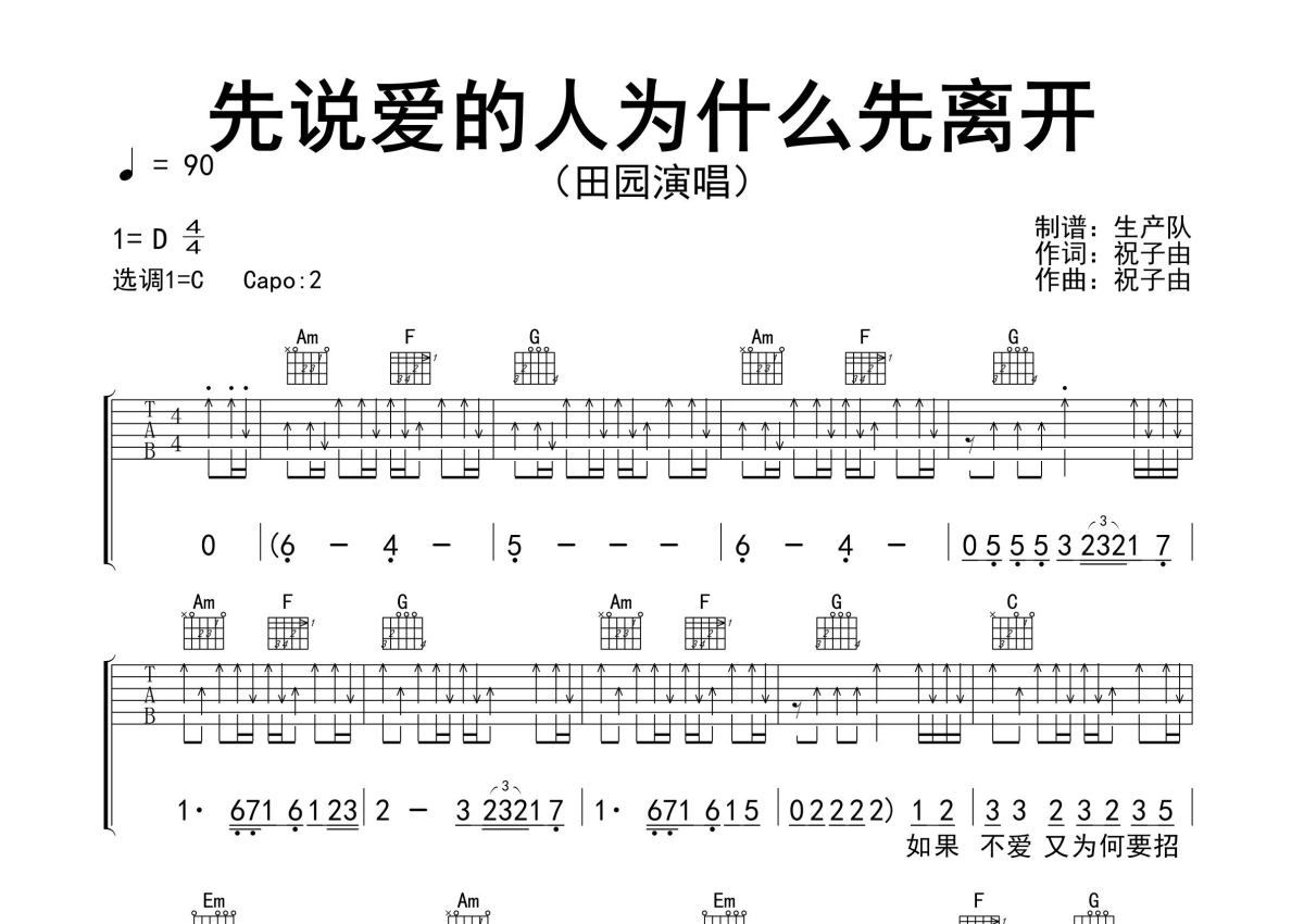 《先说爱的人为什么先离开》是田园演唱的一首歌曲,精编完美版,拍号为4/4拍,歌曲速度为每分钟90拍,歌曲原调为D调,但由于原调指法比较难,为了方便弹奏,本吉他谱采用的是C调指法编配,变调夹2品弹奏即为原调,当然也可以根据自己的音域改变变调夹位置,或者通过改变和弦调性,以方便自己弹奏,这份吉他谱共有三张高清图谱,图谱由 @生产队 编配上传,图谱使用六线谱编配,包含吉他和弦指法、简谱以及歌词部分,使用这份先说爱的人为什么先离开吉他谱,可以让你更加方便地掌握这首歌曲的弹唱技巧,快来尝试吧。田园演唱的热门歌曲《先说爱的人为什么先离开》原版吉他谱,完整的前奏、间奏、尾奏solo编配,精编完美版,值得推荐!。