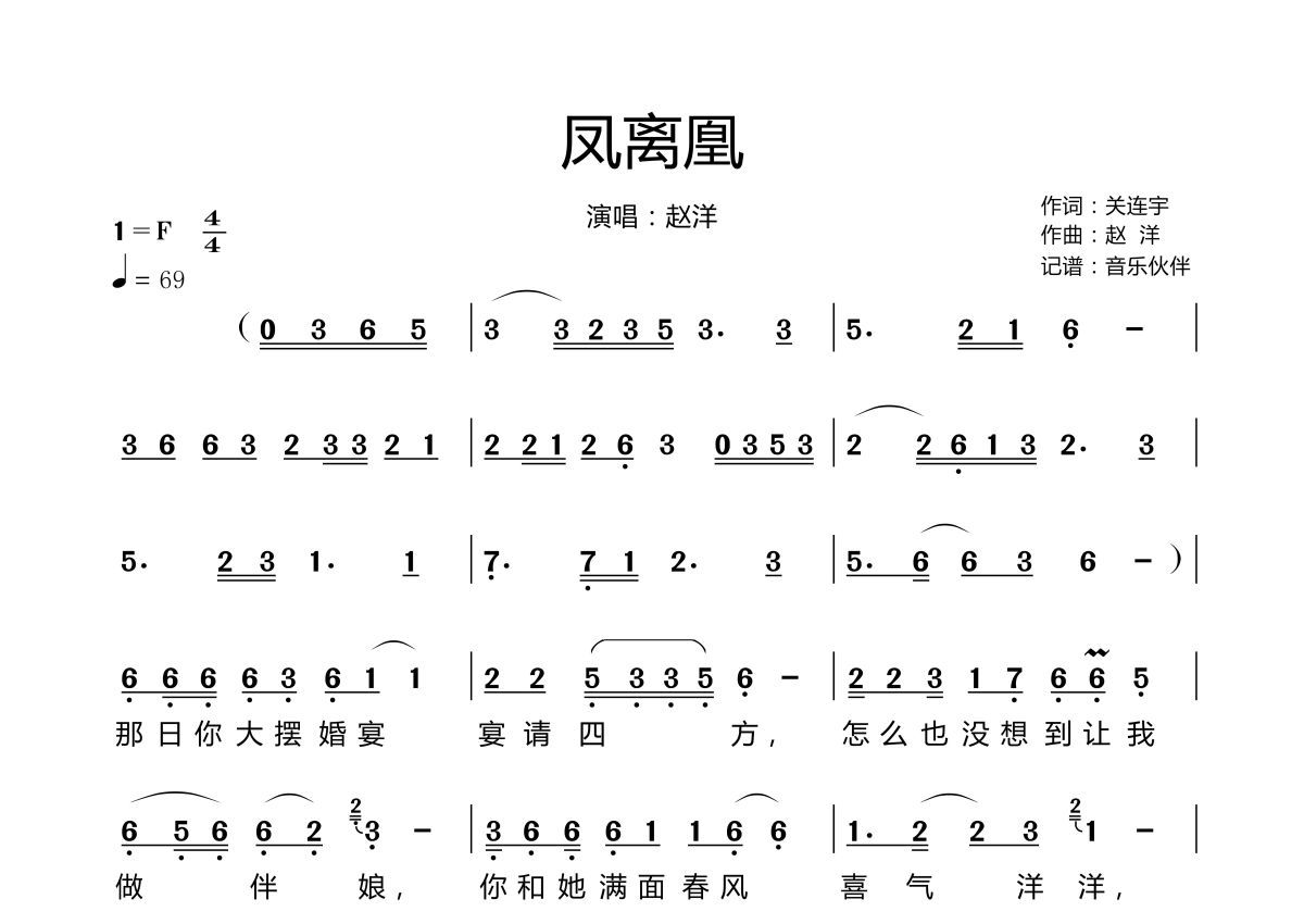 《凤离凰》是赵洋演唱的一首歌曲,拍号为4/4拍,歌曲速度为每分钟69拍,这份简谱共有两张高清图谱,图谱由 @音乐伙伴 编配上传。