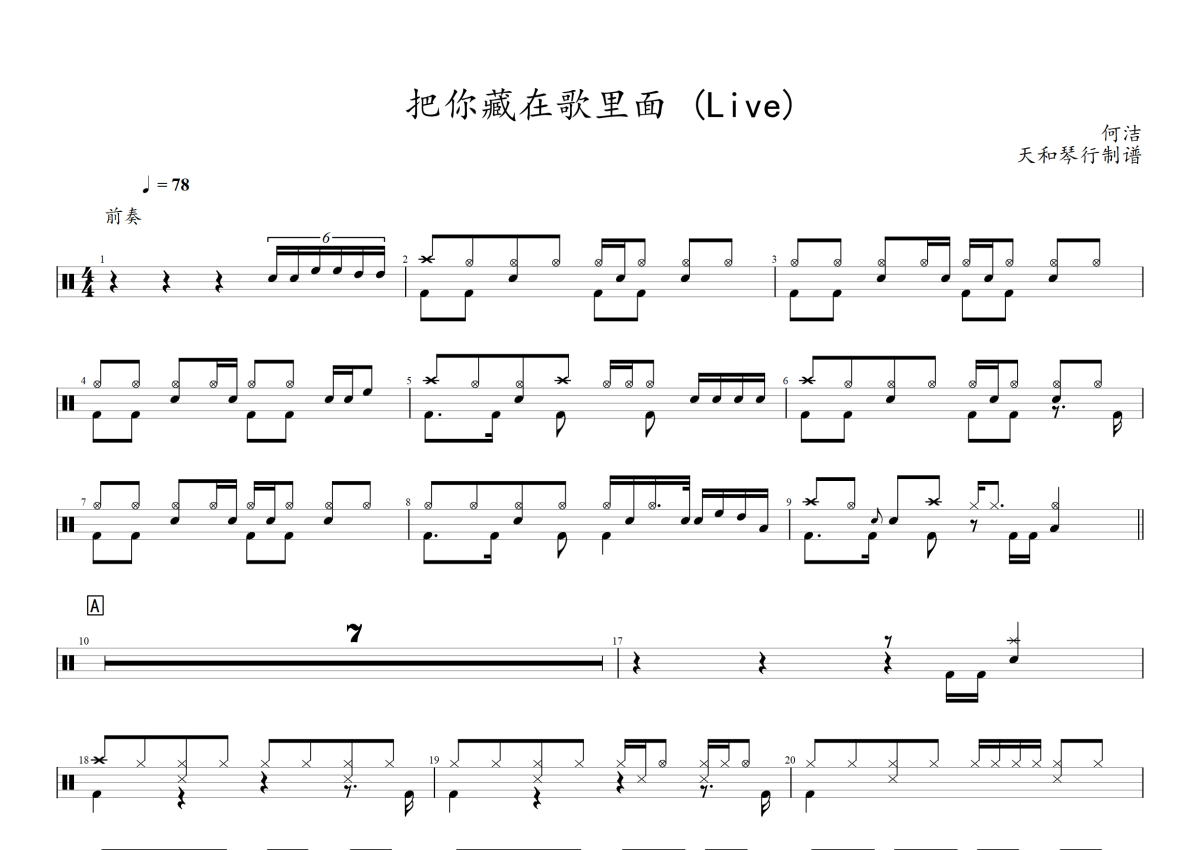 《把你藏在歌里面 (Live)》是何洁演唱的一首歌曲,拍号为4/4拍,歌曲速度为每分钟78拍,这份架子鼓谱共有两张高清图谱,图谱由 @音符喷血者 编配上传,图谱使用五线谱编配,使用这份把你藏在歌里面 (Live)架子鼓谱,你将能够轻松地敲打出这首何洁的把你藏在歌里面 (Live),快来尝试吧。