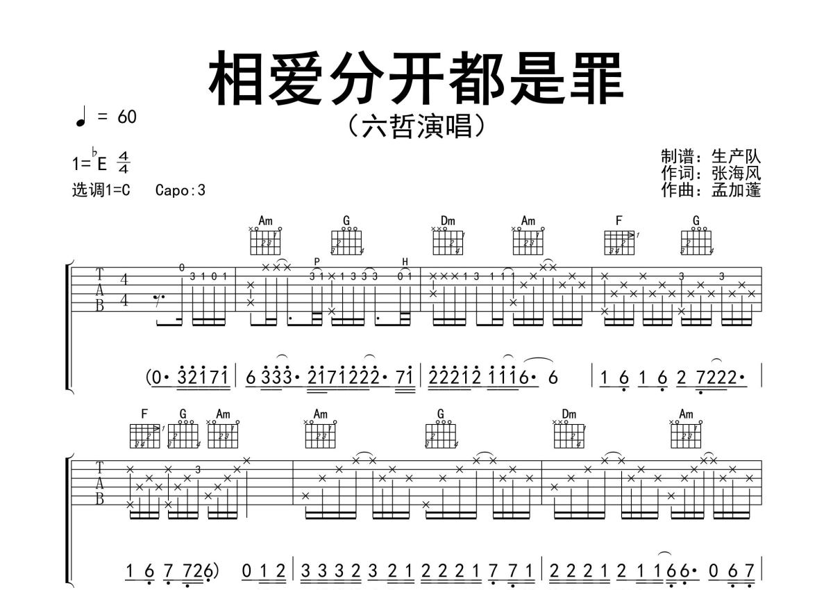 《相爱分开都是罪》是六哲演唱的一首歌曲,精编完美版,拍号为4/4拍,歌曲速度为每分钟60拍,歌曲原调为Eb调,但由于原调指法比较难,为了方便弹奏,本吉他谱采用的是C调指法编配,变调夹3品弹奏即为原调,当然也可以根据自己的音域改变变调夹位置,或者通过改变和弦调性,以方便自己弹奏,这份吉他谱共有三张高清图谱,图谱由 @生产队 编配上传,图谱使用六线谱编配,包含吉他和弦指法、简谱以及歌词部分,使用这份相爱分开都是罪吉他谱,可以让你更加方便地掌握这首歌曲的弹唱技巧,快来尝试吧。六哲演唱的歌曲《相爱分开都是罪》原版吉他谱,完整的前奏、间奏、尾奏solo编配,精编完美版,怀旧经典!。