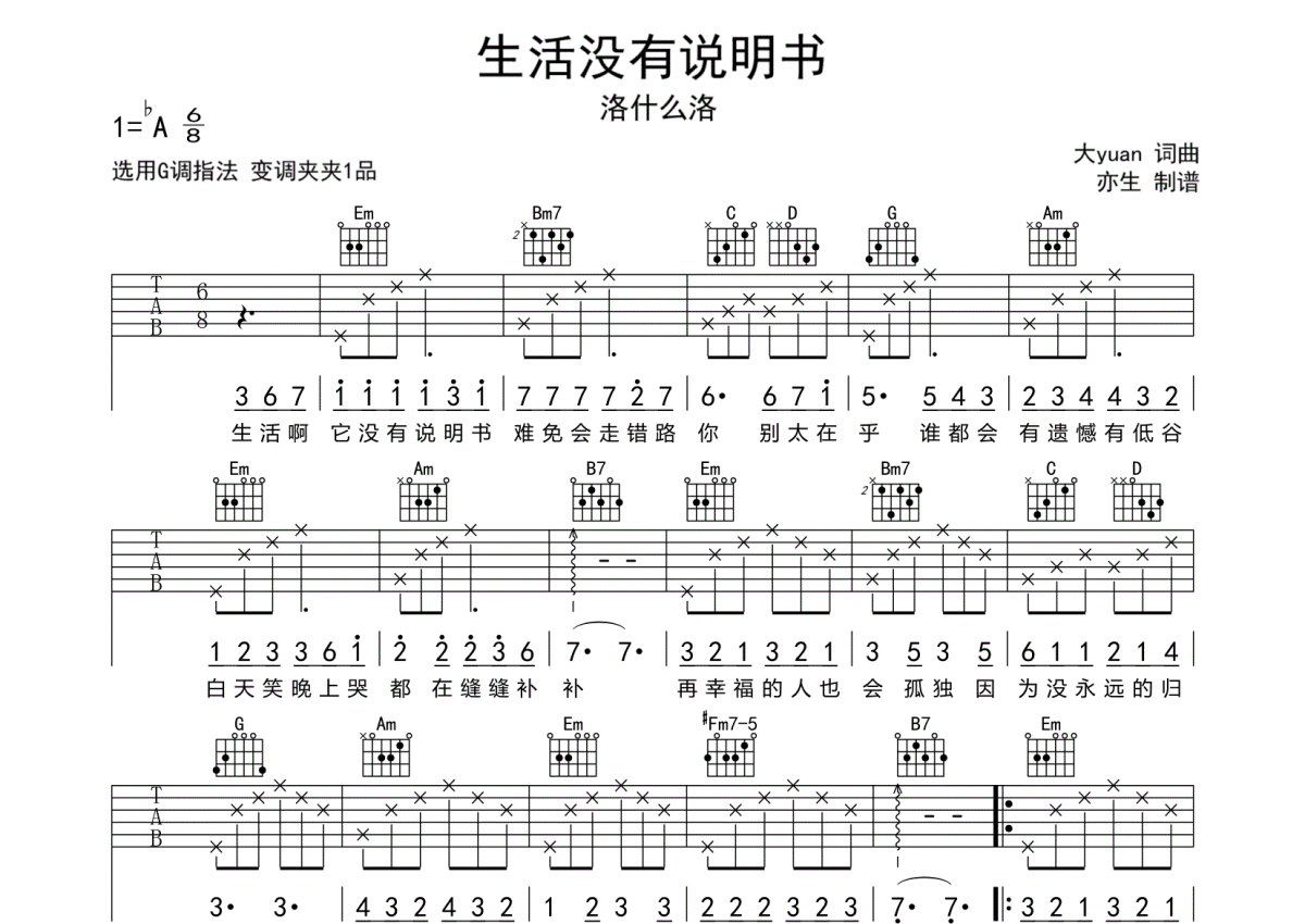 《生活没有说明书》是洛什么洛演唱的一首歌曲,拍号为4/4拍,歌曲原调为Ab调,但由于原调指法比较难,为了方便弹奏,本吉他谱采用的是G调指法编配,变调夹1品弹奏即为原调,当然也可以根据自己的音域改变变调夹位置,或者通过改变和弦调性,以方便自己弹奏,这份吉他谱共有两张高清图谱,图谱由 @亦生 编配上传,图谱使用六线谱编配,包含吉他和弦指法、简谱以及歌词部分,使用这份生活没有说明书吉他谱,可以让你更加方便地掌握这首歌曲的弹唱技巧,快来尝试吧。