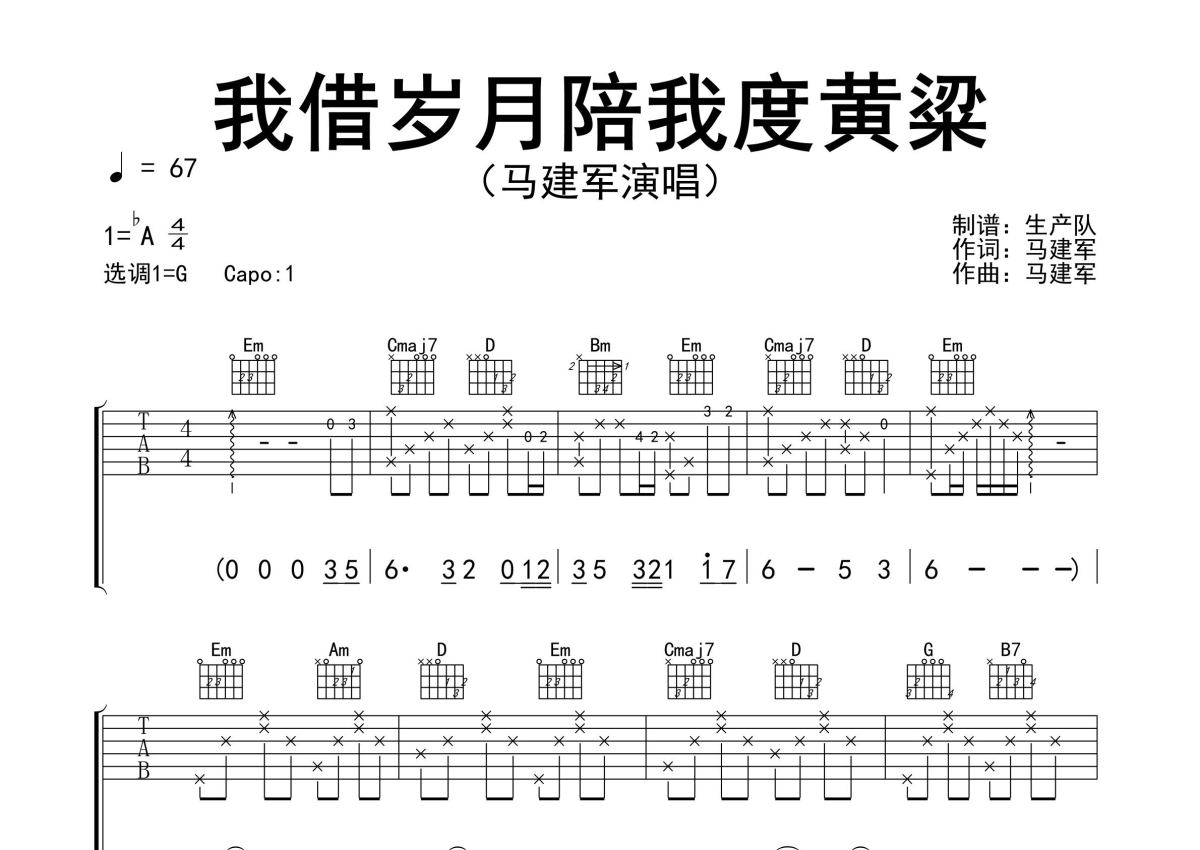 《我借岁月陪我度黄粱》是马建军演唱的一首歌曲,精编完美版,拍号为4/4拍,歌曲速度为每分钟67拍,歌曲原调为Ab调,但由于原调指法比较难,为了方便弹奏,本吉他谱采用的是G调指法编配,变调夹1品弹奏即为原调,当然也可以根据自己的音域改变变调夹位置,或者通过改变和弦调性,以方便自己弹奏,这份吉他谱共有三张高清图谱,图谱由 @生产队 编配上传,图谱使用六线谱编配,包含吉他和弦指法、简谱以及歌词部分,使用这份我借岁月陪我度黄粱吉他谱,可以让你更加方便地掌握这首歌曲的弹唱技巧,快来尝试吧。马建军作词、作曲并演唱的歌曲《我借岁月陪我度黄粱》原版吉他谱,完整的前奏、间奏、尾奏solo编配,精编完美版,值得推荐。