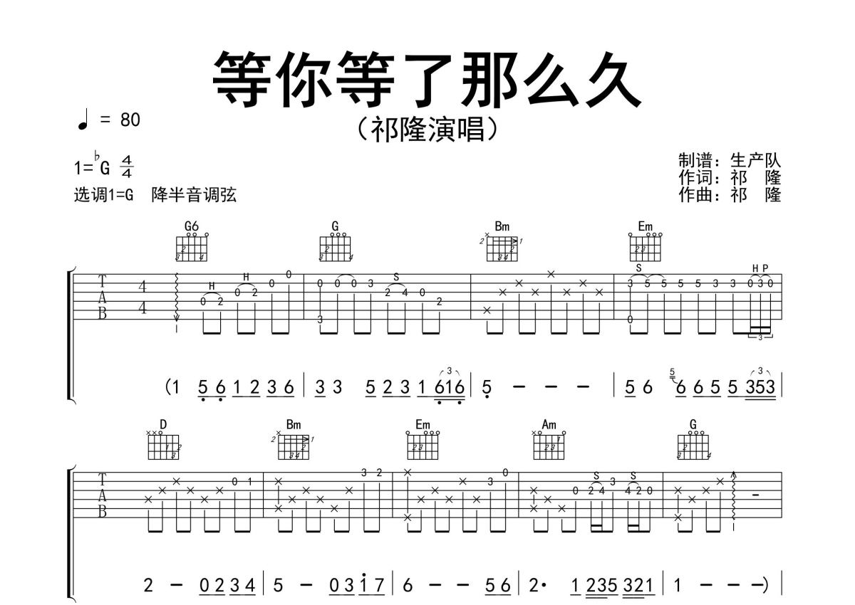祁隆《等你等了那么久》吉他谱 - G调弹唱六线谱 - 精编完美版
