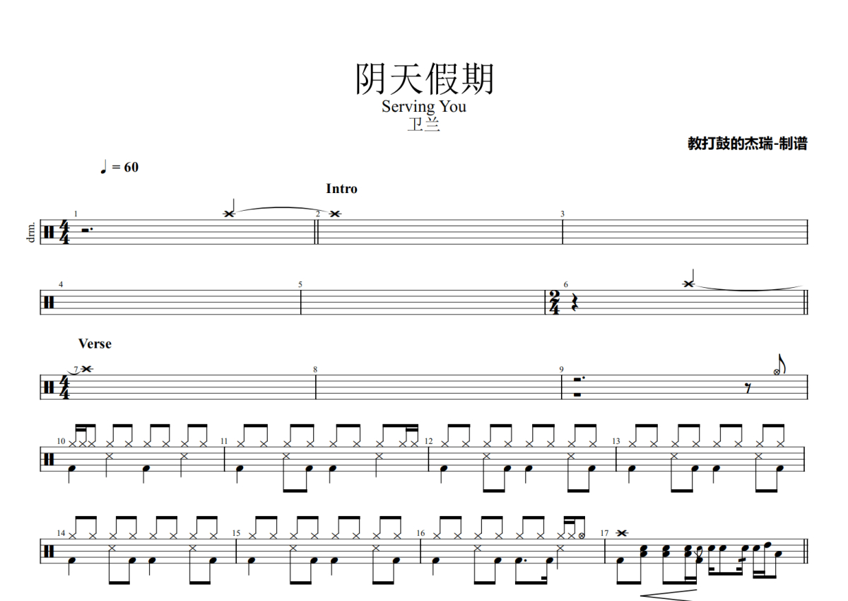 《阴天假期》是卫兰演唱的一首歌曲,拍号为4/4拍,歌曲速度为每分钟60拍,这份架子鼓谱共有两张高清图谱,图谱由 @Jerry 编配上传,图谱使用五线谱编配,使用这份阴天假期架子鼓谱,你将能够轻松地敲打出这首卫兰的阴天假期,快来尝试吧。