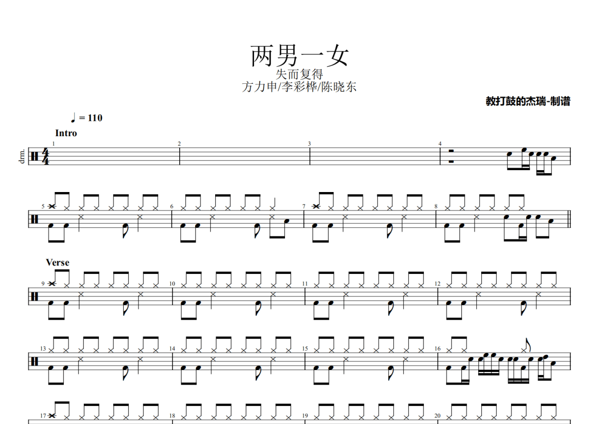 《两男一女》是方力申/李彩桦/陈晓东演唱的一首歌曲,这份架子鼓谱共有三张高清图谱,图谱由 @Jerry 编配上传,图谱使用五线谱编配,使用这份两男一女架子鼓谱,你将能够轻松地敲打出这首方力申/李彩桦/陈晓东的两男一女,快来尝试吧。