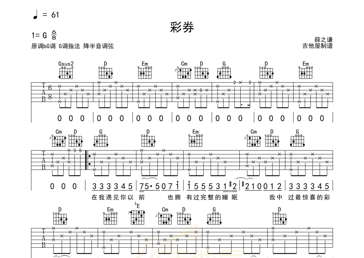 薛之谦《彩券》吉他谱 - G调弹唱六线谱
