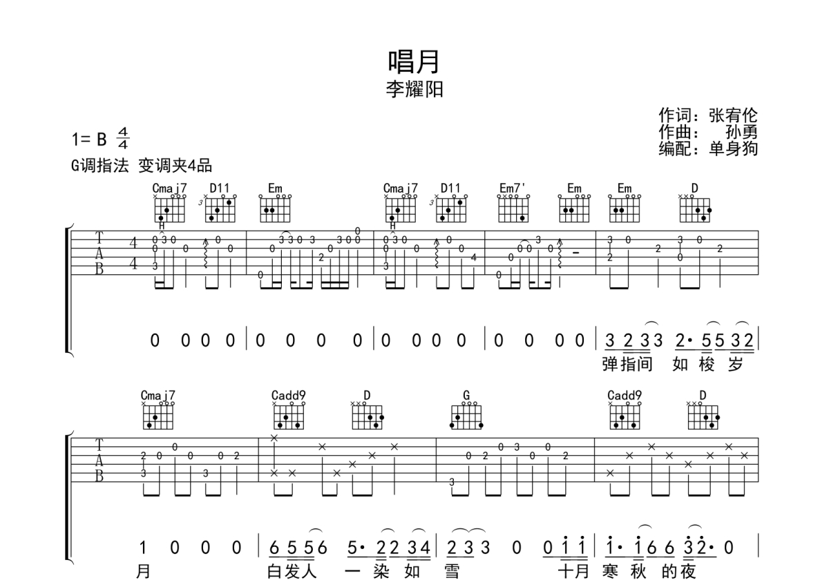 《唱月》是李耀阳演唱的一首歌曲,拍号为4/4拍,歌曲原调为B调,但由于原调指法比较难,为了方便弹奏,本吉他谱采用的是G调指法编配,变调夹4品弹奏即为原调,当然也可以根据自己的音域改变变调夹位置,或者通过改变和弦调性,以方便自己弹奏,这份吉他谱共有四张高清图谱,图谱由 @单身狗 编配上传,图谱使用六线谱编配,包含吉他和弦指法、简谱以及歌词部分,使用这份唱月吉他谱,可以让你更加方便地掌握这首歌曲的弹唱技巧,快来尝试吧。