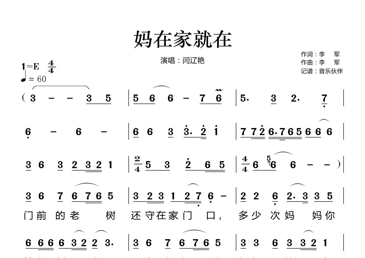 《妈在家就在》是闫辽艳演唱的一首歌曲,这份简谱共有两张高清图谱,图谱由 @音乐伙伴 编配上传。