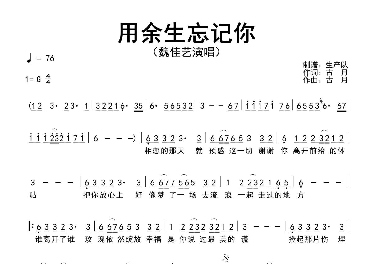 魏佳艺《用余生忘记你》简谱 - 原版简谱