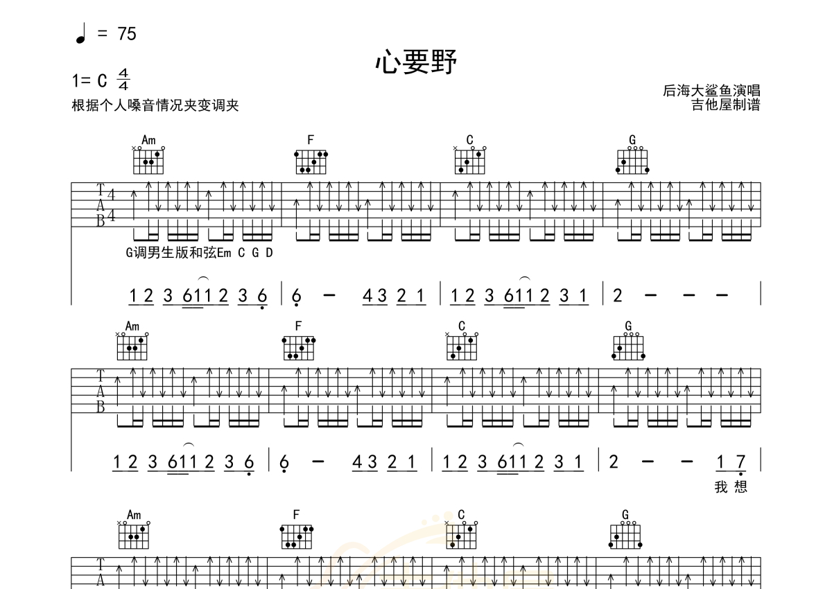 后海大鲨鱼《心要野》吉他谱 - C调弹唱六线谱