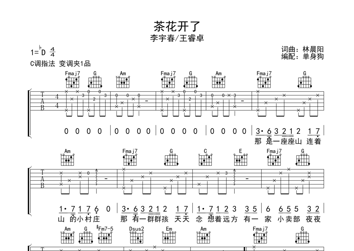 李宇春/王睿卓《茶花开了》吉他谱 - C调弹唱六线谱