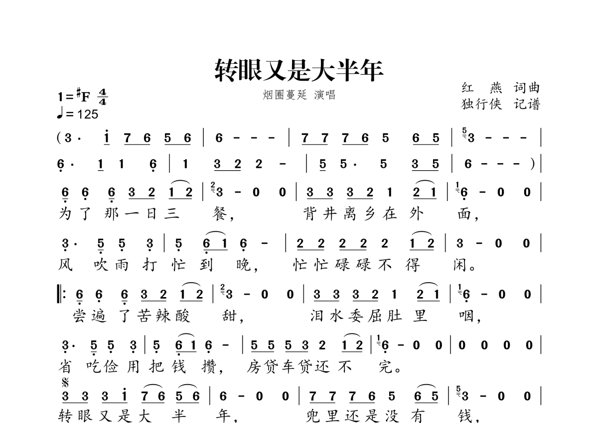 《转眼又是大半年》是烟圈蔓延演唱的一首歌曲,拍号为4/4拍,歌曲速度为每分钟125拍,这份简谱共有一张高清图谱,图谱由 @独行侠 编配上传。