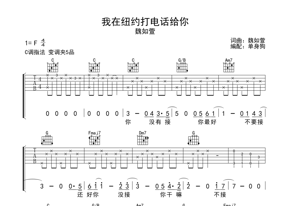 魏如萱《我在纽约打电话给你》吉他谱 - C调弹唱六线谱
