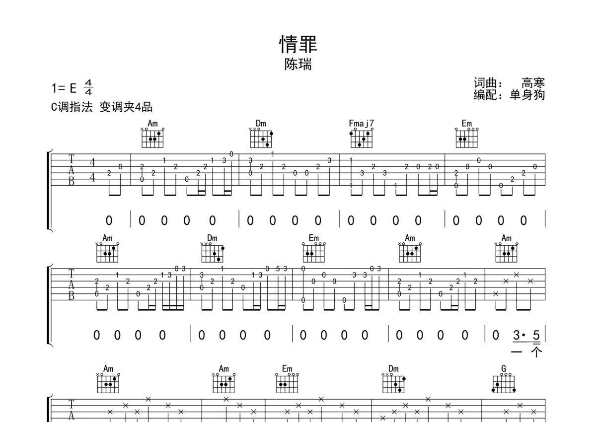 陈瑞《情罪》吉他谱 - C调弹唱六线谱