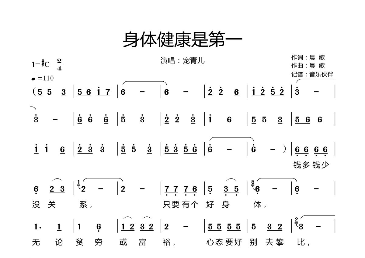 《身体健康是第一》是宠青儿演唱的一首歌曲,拍号为2/4拍,歌曲速度为每分钟110拍,这份简谱共有两张高清图谱,图谱由 @音乐伙伴 编配上传。