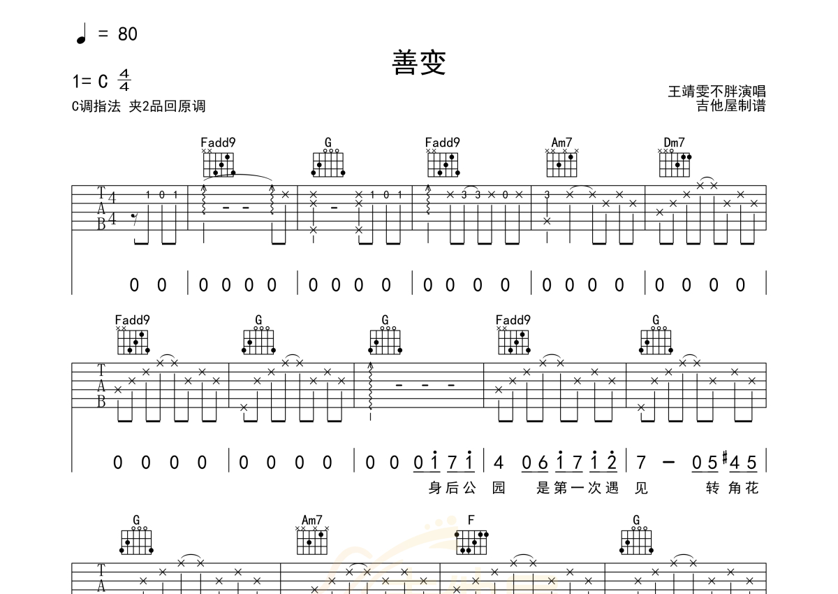 《善变》是王靖雯不胖演唱的一首歌曲,本吉他谱采用的是C调指法编配,这份吉他谱共有三张高清图谱,图谱由 @吉他屋 编配上传,图谱使用六线谱编配,包含吉他和弦指法、简谱以及歌词部分,使用这份善变吉他谱,可以让你更加方便地掌握这首歌曲的弹唱技巧,快来尝试吧。王靖雯不胖《善变》吉他谱_C调吉他弹唱谱。