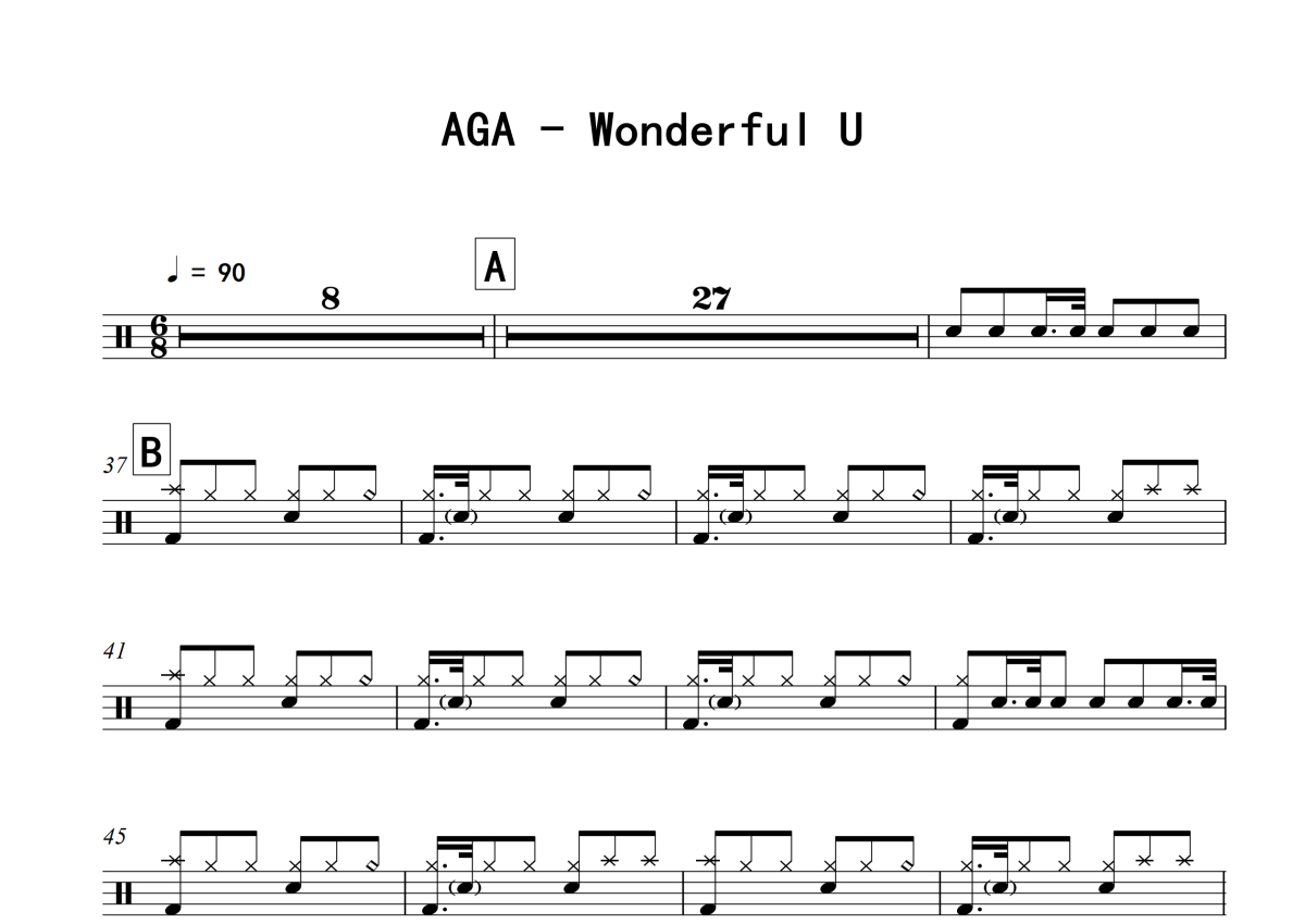 《Wonderful U》是AGA演唱的一首歌曲,拍号为6/8拍,歌曲速度为每分钟90拍,这份架子鼓谱共有两张高清图谱,图谱由 @积极处世 编配上传,图谱使用五线谱编配,使用这份Wonderful U架子鼓谱,你将能够轻松地敲打出这首AGA的Wonderful U,快来尝试吧。
