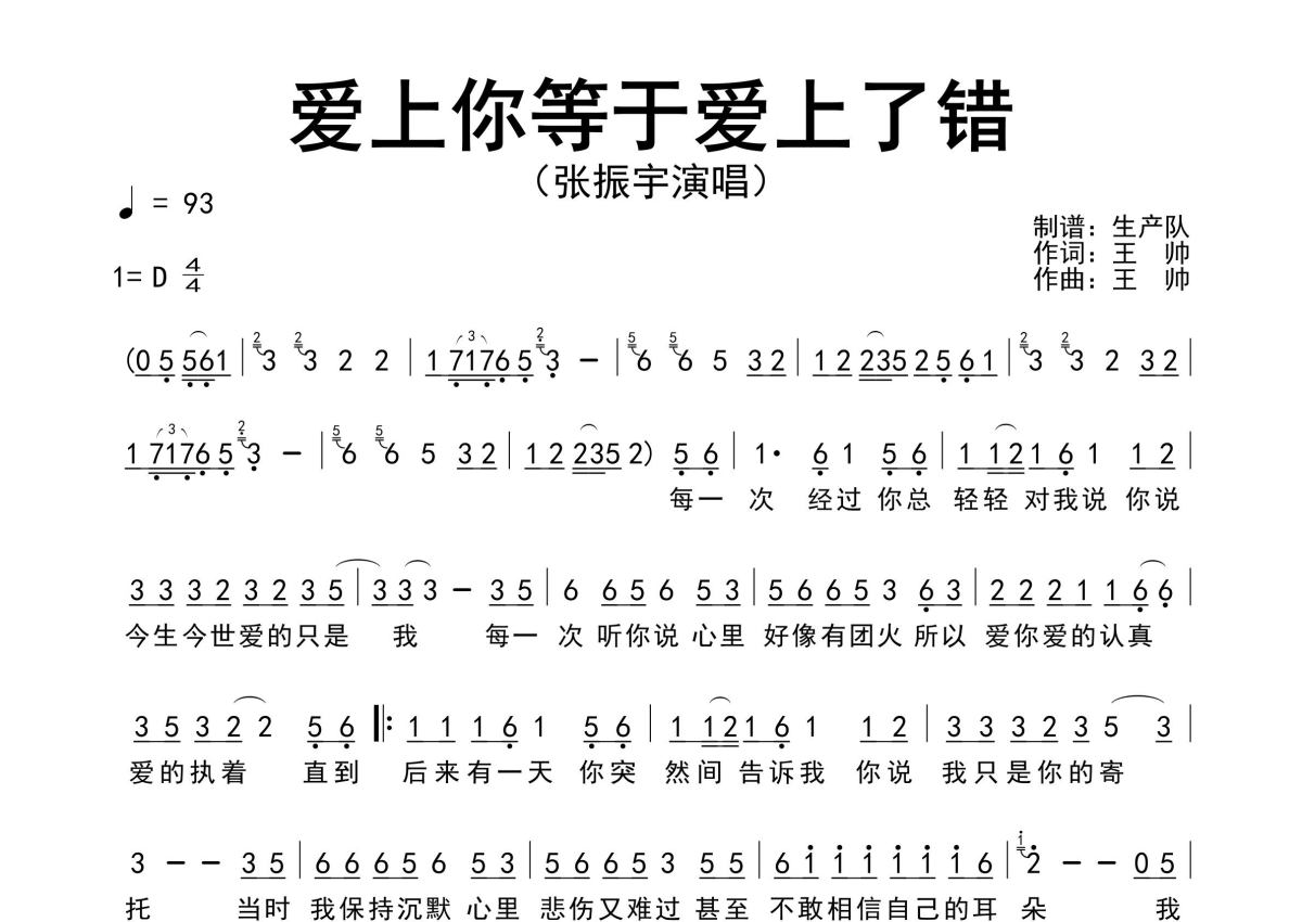 《爱上你等于爱上了错》是张振宇演唱的一首歌曲,原版简谱,拍号为4/4拍,歌曲速度为每分钟93拍,这份简谱共有一张高清图谱,图谱由 @生产队 编配上传张振宇演唱的经典歌曲《爱上你等于爱上了错》原版简谱,完整的前奏、间奏solo编配。