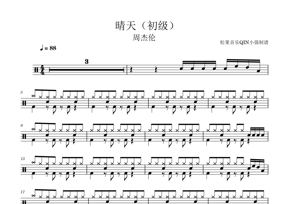 周杰伦《晴天》架子鼓谱 - 初级版