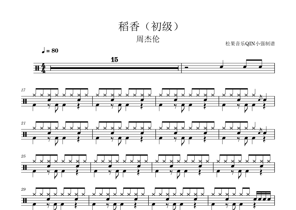《稻香》是周杰伦演唱的一首歌曲,初级版,拍号为4/4拍,歌曲速度为每分钟80拍,这份架子鼓谱共有两张高清图谱,图谱由 @松果音乐QIN小强 编配上传,图谱使用五线谱编配,使用这份稻香架子鼓谱,你将能够轻松地敲打出这首周杰伦的稻香,快来尝试吧。稻香 周杰伦 初级编配 适合初学者初学必备。