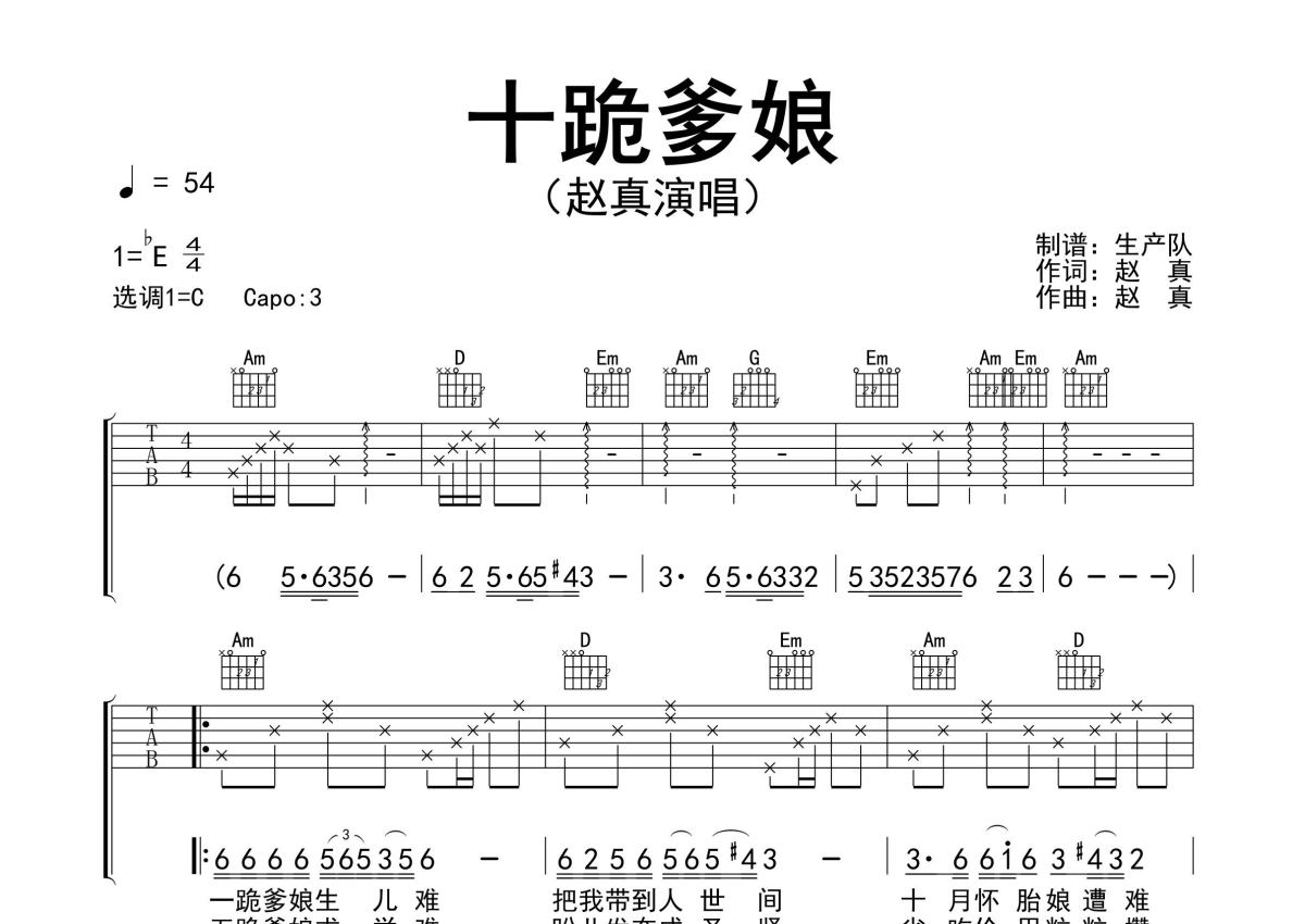 《十跪爹娘》是赵真演唱的一首歌曲,精编完美版,拍号为4/4拍,歌曲速度为每分钟54拍,歌曲原调为Eb调,但由于原调指法比较难,为了方便弹奏,本吉他谱采用的是C调指法编配,变调夹3品弹奏即为原调,当然也可以根据自己的音域改变变调夹位置,或者通过改变和弦调性,以方便自己弹奏,这份吉他谱共有三张高清图谱,图谱由 @生产队 编配上传,图谱使用六线谱编配,包含吉他和弦指法、简谱以及歌词部分,使用这份十跪爹娘吉他谱,可以让你更加方便地掌握这首歌曲的弹唱技巧,快来尝试吧。赵真作词、作曲并演唱的经典歌曲《十跪爹娘》原版吉他谱,完整的前奏、间奏solo编配,精编完美版,致敬经典!。