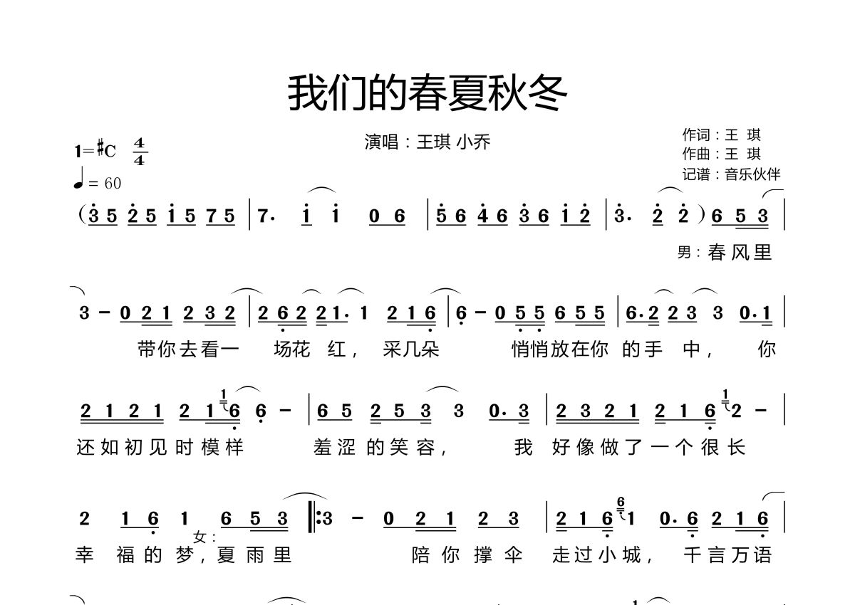 《我们的春夏秋冬》是王琪 小乔演唱的一首歌曲,拍号为4/4拍,歌曲速度为每分钟60拍,这份简谱共有两张高清图谱,图谱由 @音乐伙伴 编配上传。