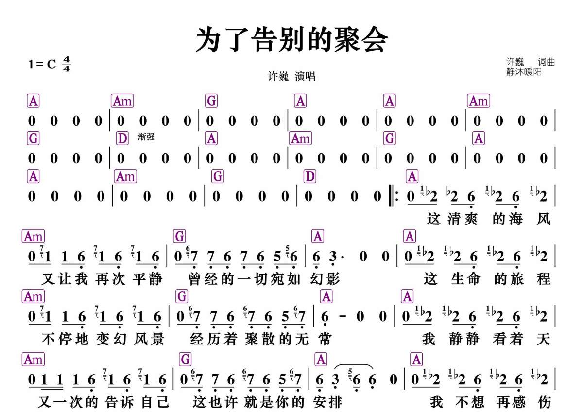 《为了告别的聚会》是许巍演唱的一首歌曲,和弦谱,拍号为4/4拍,这份简谱共有一张高清图谱,图谱由 @静沐暖阳 编配上传选调C。