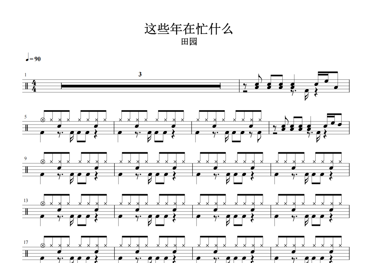 《这些年在忙什么》是田园演唱的一首歌曲,拍号为4/4拍,歌曲速度为每分钟90拍,这份架子鼓谱共有两张高清图谱,图谱由 @放晴的天空 编配上传,图谱使用五线谱编配,使用这份这些年在忙什么架子鼓谱,你将能够轻松地敲打出这首田园的这些年在忙什么,快来尝试吧。