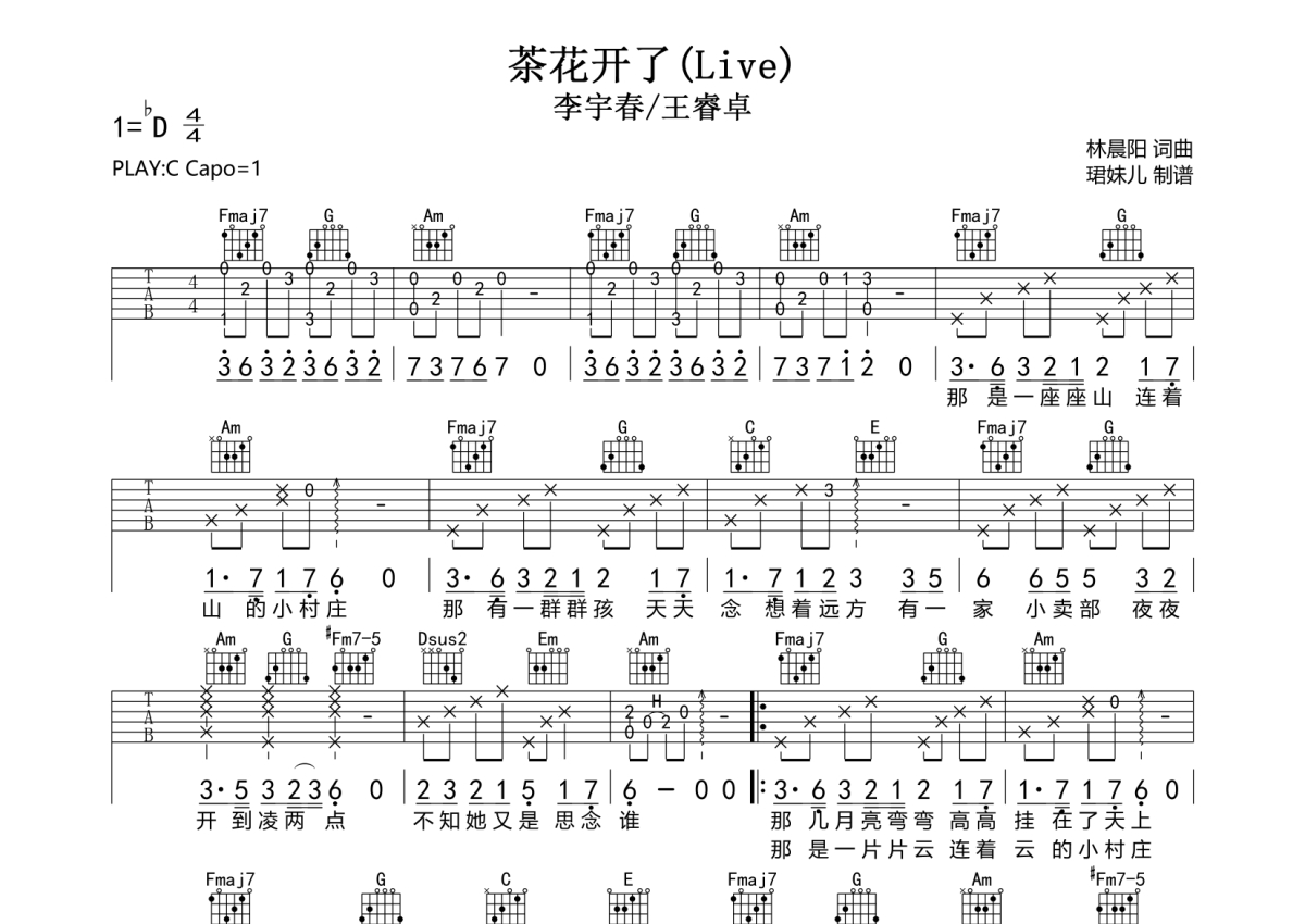 《茶花开了》是李宇春/王睿卓演唱的一首歌曲,拍号为4/4拍,歌曲速度为每分钟85拍,歌曲原调为Db调,但由于原调指法比较难,为了方便弹奏,本吉他谱采用的是C调指法编配,变调夹1品弹奏即为原调,当然也可以根据自己的音域改变变调夹位置,或者通过改变和弦调性,以方便自己弹奏,这份吉他谱共有两张高清图谱,图谱由 @珺妹儿 编配上传,图谱使用六线谱编配,包含吉他和弦指法、简谱以及歌词部分,使用这份茶花开了吉他谱,可以让你更加方便地掌握这首歌曲的弹唱技巧,快来尝试吧。