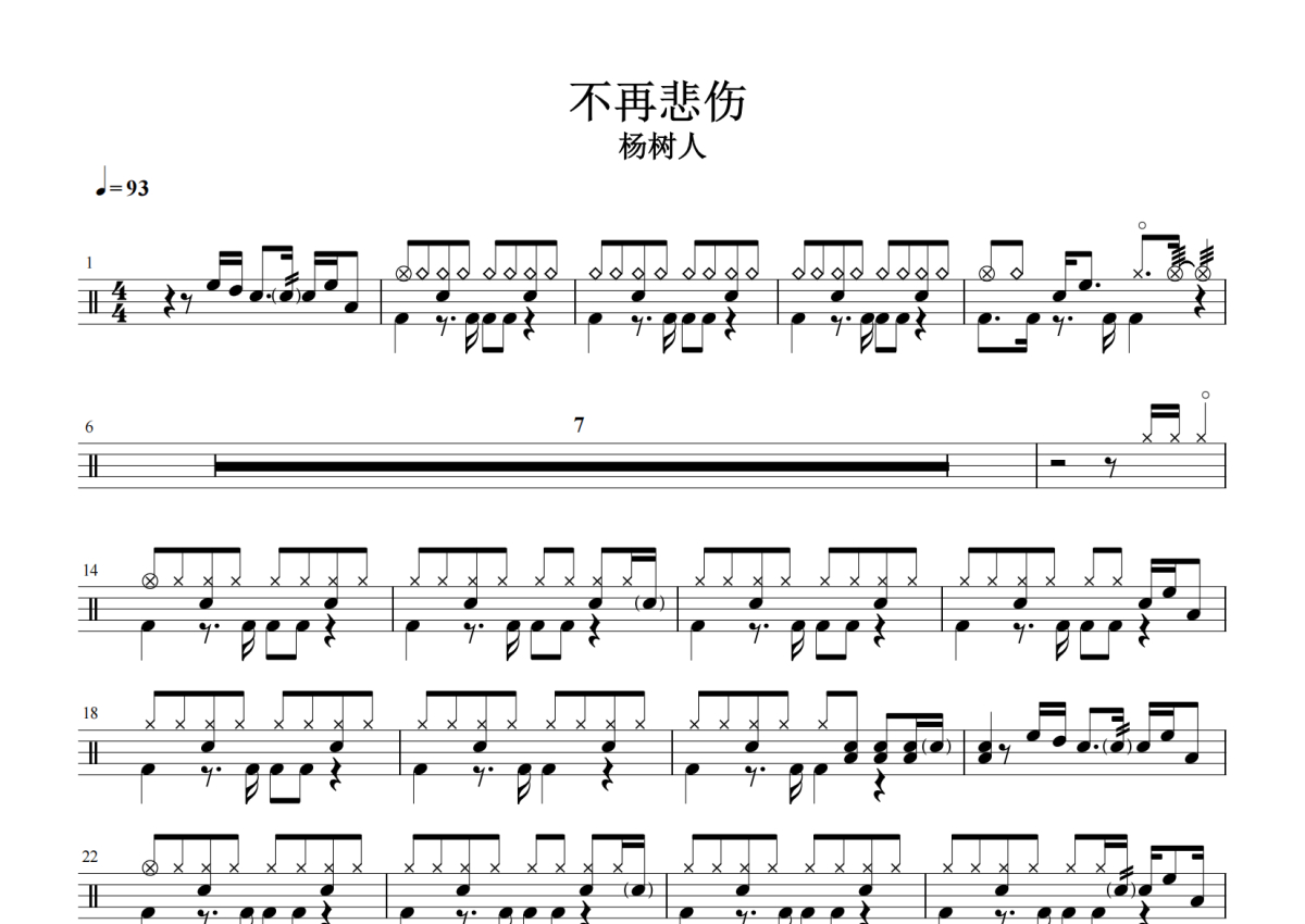 《不再悲伤》是杨树人演唱的一首歌曲,拍号为4/4拍,歌曲速度为每分钟93拍,这份架子鼓谱共有两张高清图谱,图谱由 @放晴的天空 编配上传,图谱使用五线谱编配,使用这份不再悲伤架子鼓谱,你将能够轻松地敲打出这首杨树人的不再悲伤,快来尝试吧。