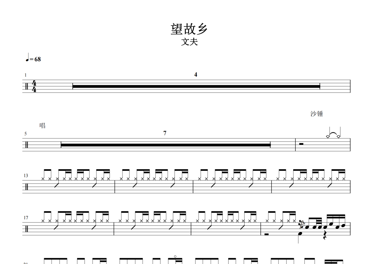 《望故乡》是文夫演唱的一首歌曲,拍号为4/4拍,歌曲速度为每分钟68拍,这份架子鼓谱共有两张高清图谱,图谱由 @放晴的天空 编配上传,图谱使用五线谱编配,使用这份望故乡架子鼓谱,你将能够轻松地敲打出这首文夫的望故乡,快来尝试吧。