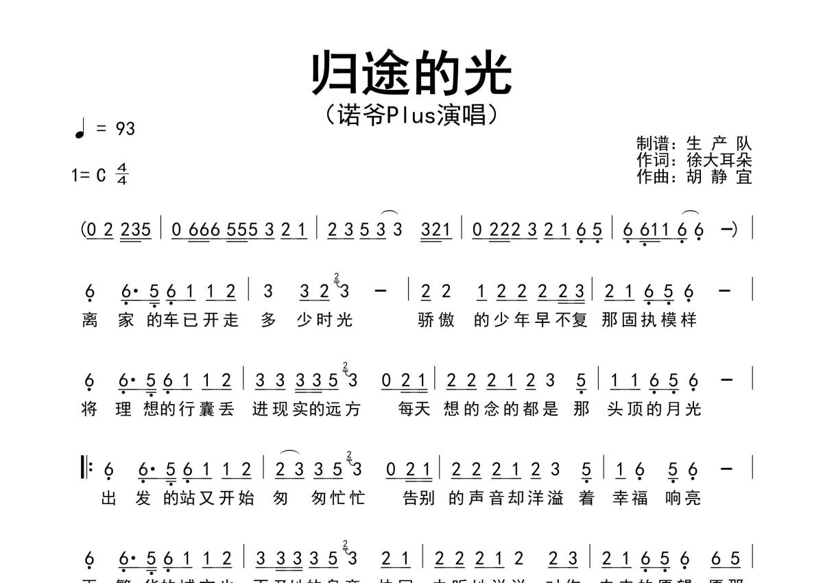 《归途的光》是诺爷plus演唱的一首歌曲,原版简谱,拍号为4/4拍,歌曲速度为每分钟93拍,这份简谱共有一张高清图谱,图谱由 @生产队 编配上传诺爷plus演唱的歌曲《归途的光》原版简谱,完整的前奏、间奏、尾奏solo编配。