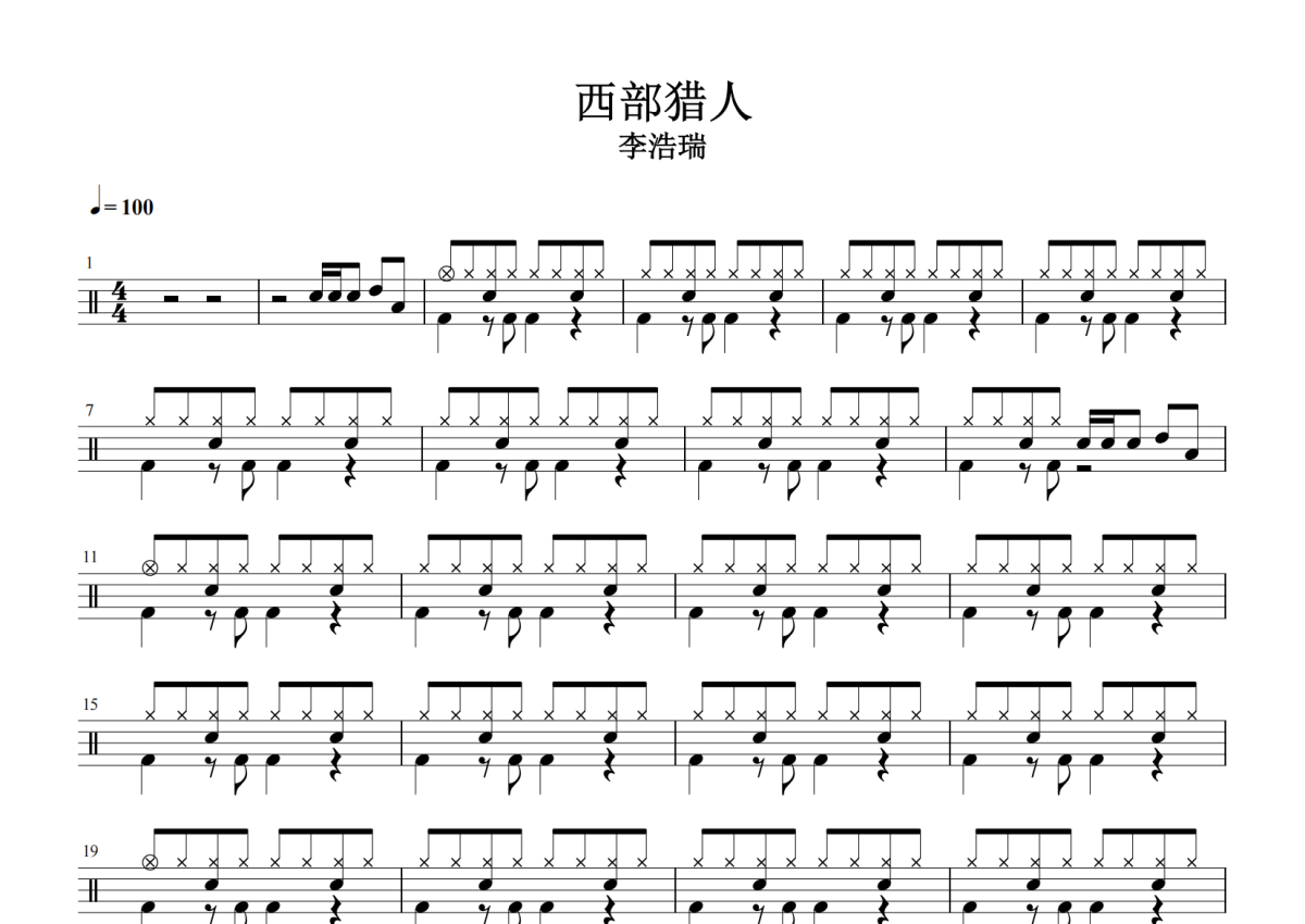 《西部猎人》是李浩瑞演唱的一首歌曲,拍号为4/4拍,歌曲速度为每分钟100拍,这份架子鼓谱共有三张高清图谱,图谱由 @放晴的天空 编配上传,图谱使用五线谱编配,使用这份西部猎人架子鼓谱,你将能够轻松地敲打出这首李浩瑞的西部猎人,快来尝试吧。