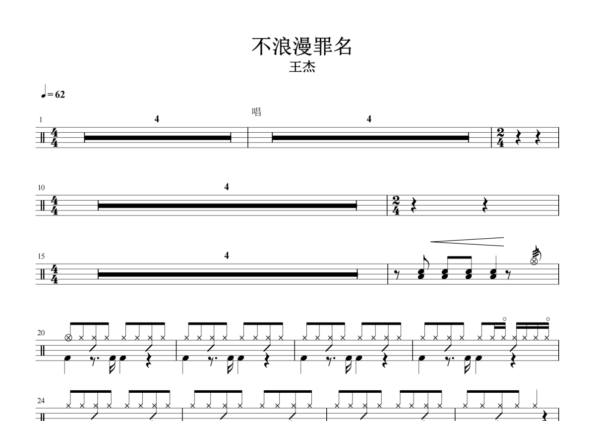 《不浪漫罪名》是王杰演唱的一首歌曲,拍号为4/4拍,歌曲速度为每分钟62拍,这份架子鼓谱共有两张高清图谱,图谱由 @放晴的天空 编配上传,图谱使用五线谱编配,使用这份不浪漫罪名架子鼓谱,你将能够轻松地敲打出这首王杰的不浪漫罪名,快来尝试吧。