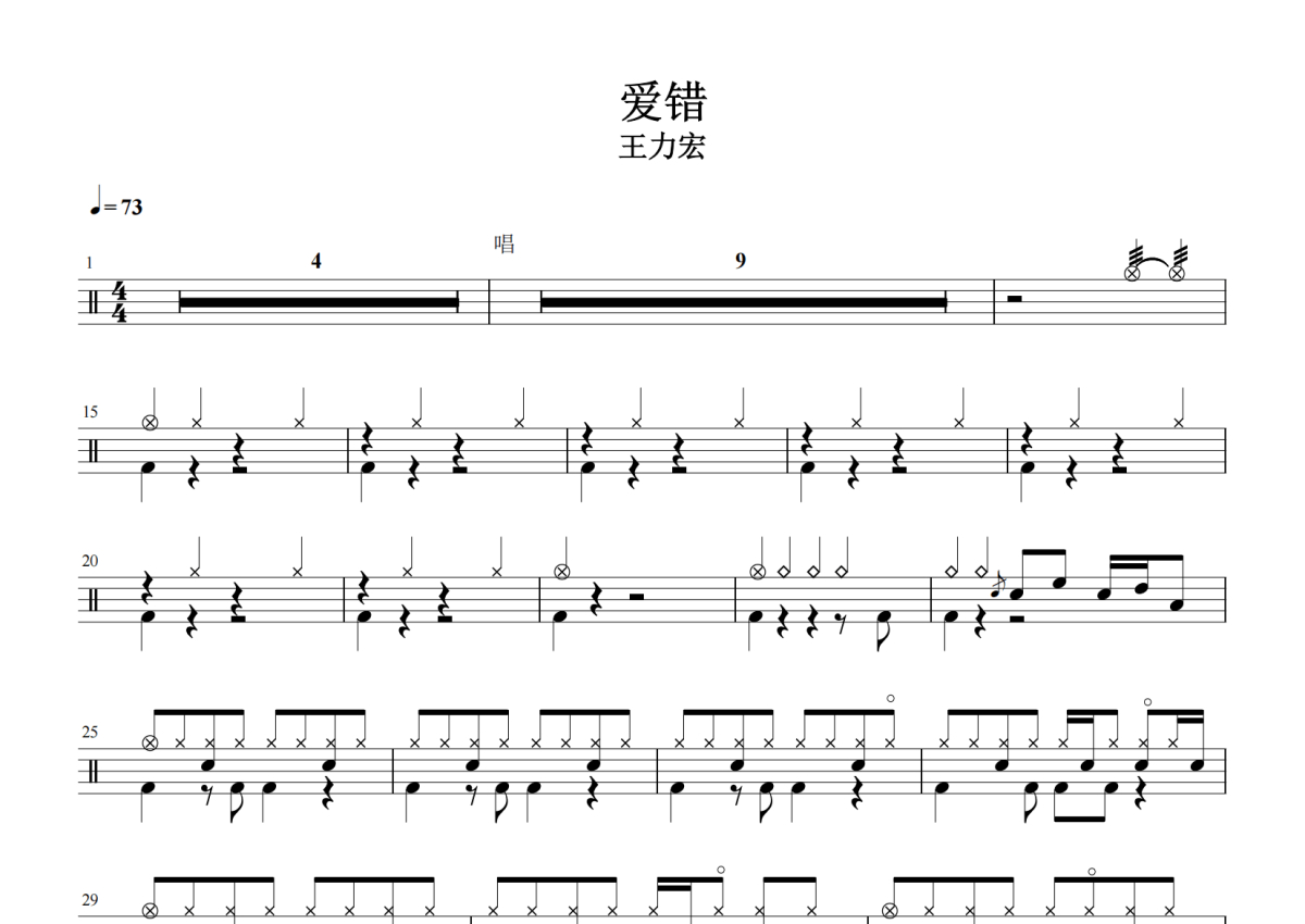 《爱错》是王力宏演唱的一首歌曲,拍号为4/4拍,歌曲速度为每分钟73拍,这份架子鼓谱共有两张高清图谱,图谱由 @放晴的天空 编配上传,图谱使用五线谱编配,使用这份爱错架子鼓谱,你将能够轻松地敲打出这首王力宏的爱错,快来尝试吧。