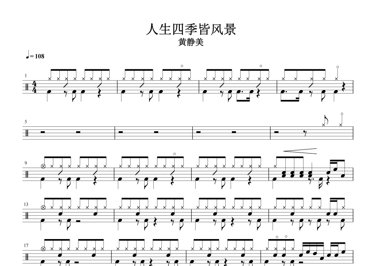 《人生四季皆风景》是黄静美演唱的一首歌曲,拍号为4/4拍,歌曲速度为每分钟108拍,这份架子鼓谱共有两张高清图谱,图谱由 @放晴的天空 编配上传,图谱使用五线谱编配,使用这份人生四季皆风景架子鼓谱,你将能够轻松地敲打出这首黄静美的人生四季皆风景,快来尝试吧。