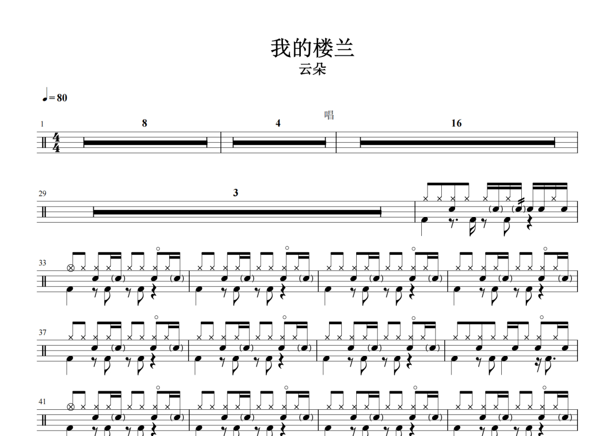 《我的楼兰》是云朵演唱的一首歌曲,拍号为4/4拍,歌曲速度为每分钟80拍,这份架子鼓谱共有两张高清图谱,图谱由 @放晴的天空 编配上传,图谱使用五线谱编配,使用这份我的楼兰架子鼓谱,你将能够轻松地敲打出这首云朵的我的楼兰,快来尝试吧。