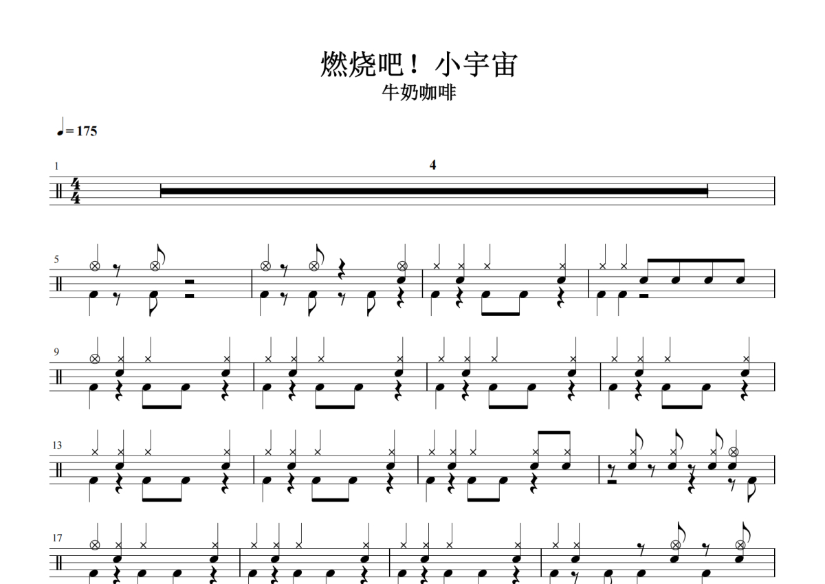 《燃烧吧!小宇宙》是牛奶咖啡演唱的一首歌曲,拍号为4/4拍,歌曲速度为每分钟175拍,这份架子鼓谱共有四张高清图谱,图谱由 @放晴的天空 编配上传,图谱使用五线谱编配,使用这份燃烧吧!小宇宙架子鼓谱,你将能够轻松地敲打出这首牛奶咖啡的燃烧吧!小宇宙,快来尝试吧。